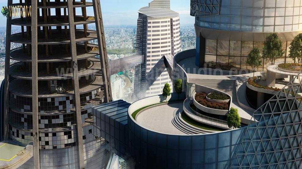 Contemporary Sky Exterior Architectural Rendering High-Rise landscaping, USA