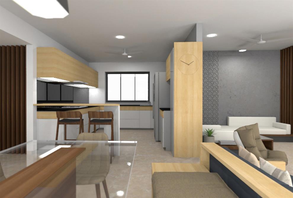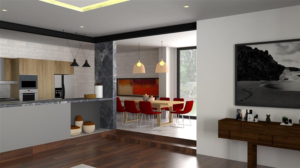 In homes where space is not a constraint, the formal dining area is kept separate and a small breakfast bar is included in the kitchen; for convenience.