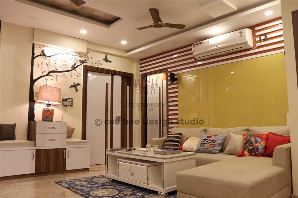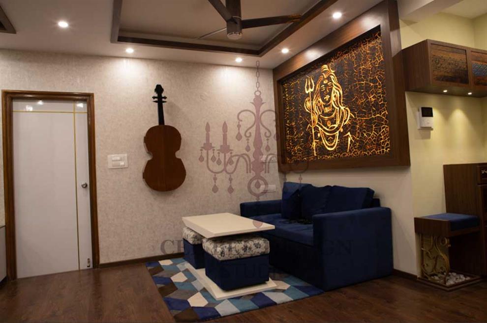 A typical Indian living room may contain furnishings such as a sofa, chairs, centre tables, and bookshelves, electric lamps and rugs.