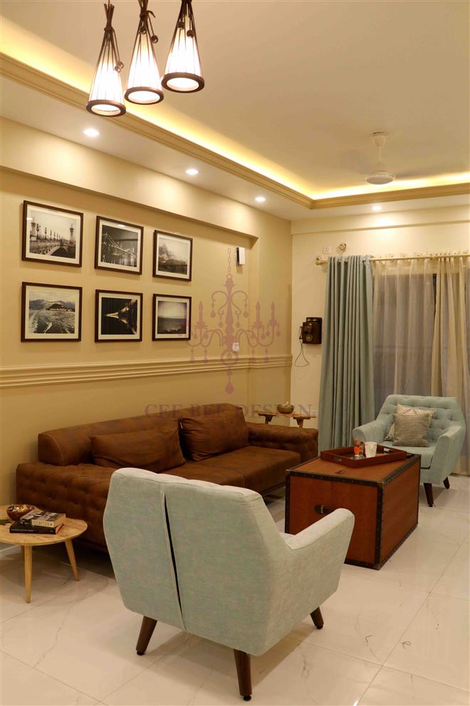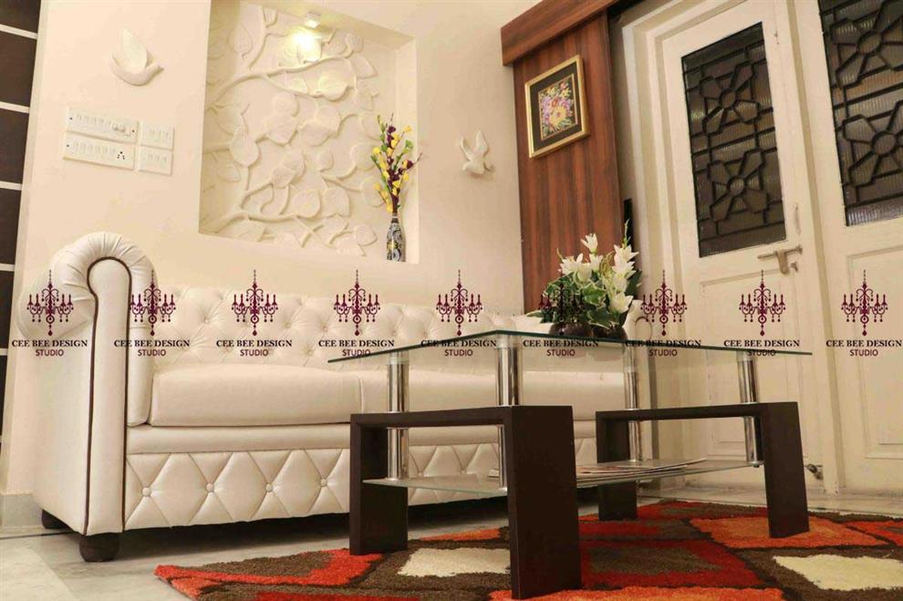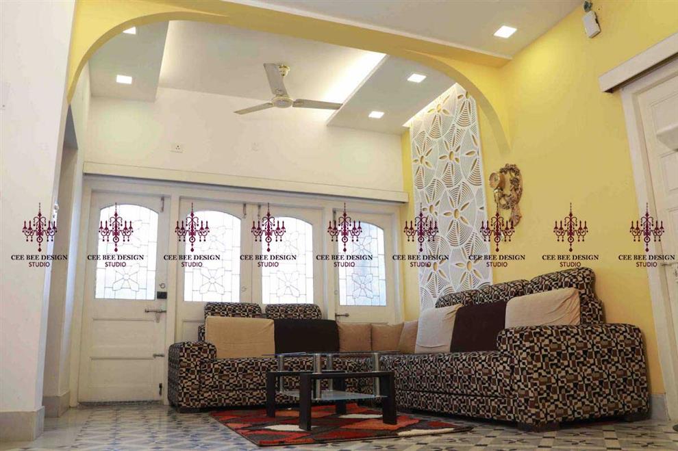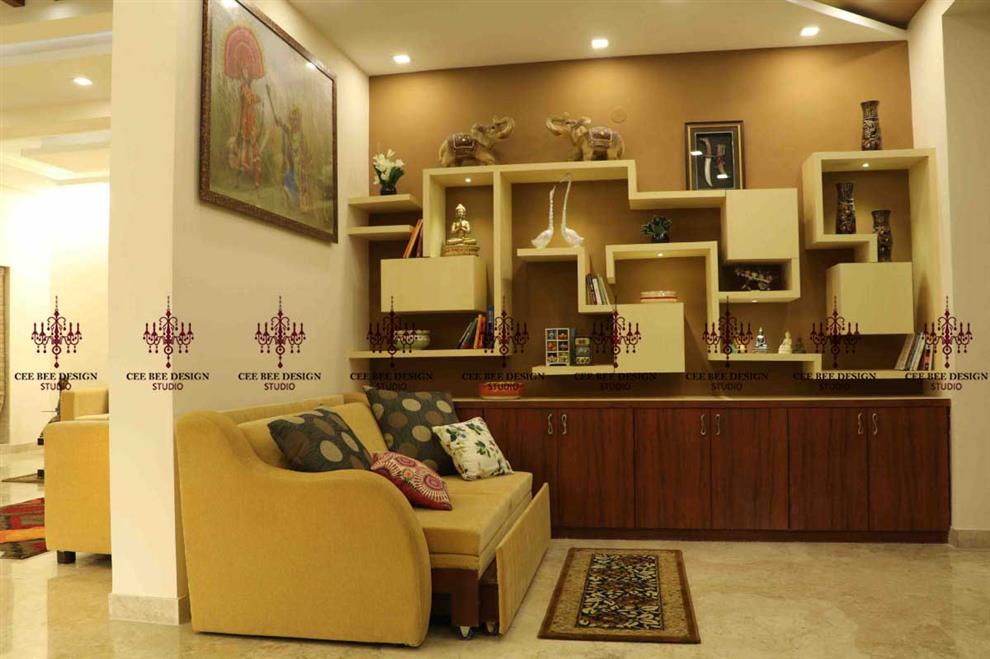A typical Indian living room may contain furnishings such as a sofa, chairs, centre tables, and bookshelves, electric lamps and rugs.