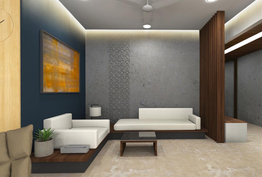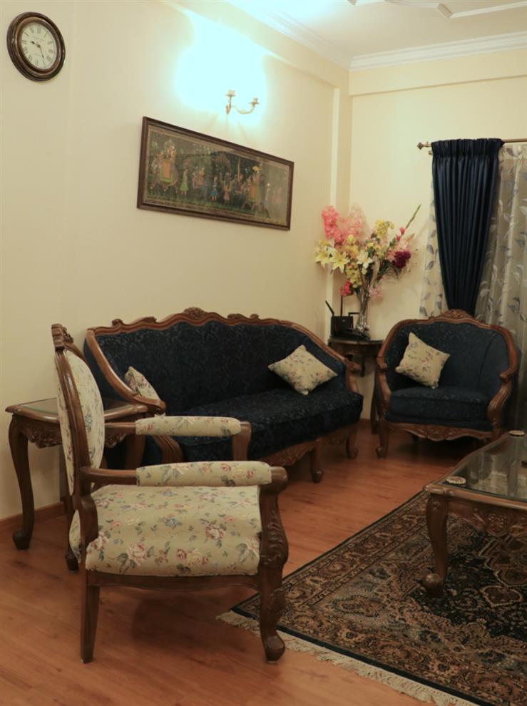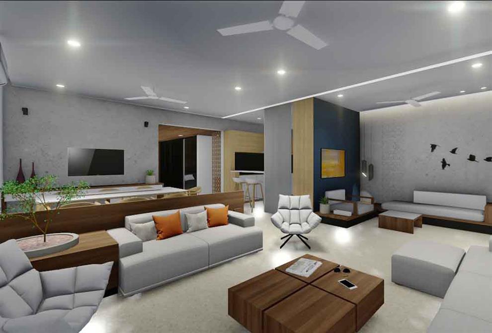 A typical Indian living room may contain furnishings such as a sofa, chairs, centre tables, and bookshelves, electric lamps and rugs.