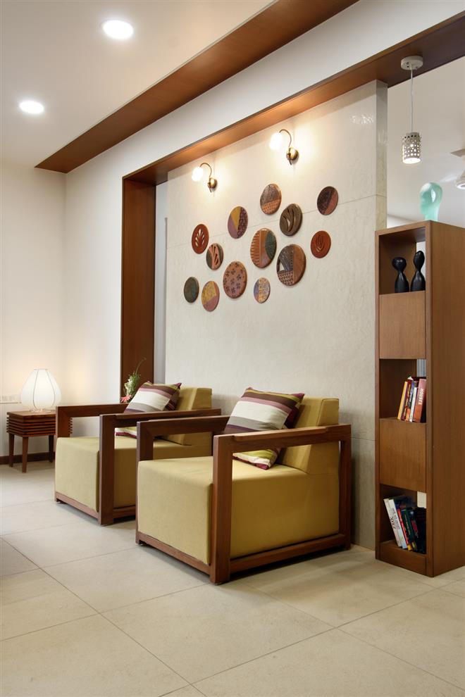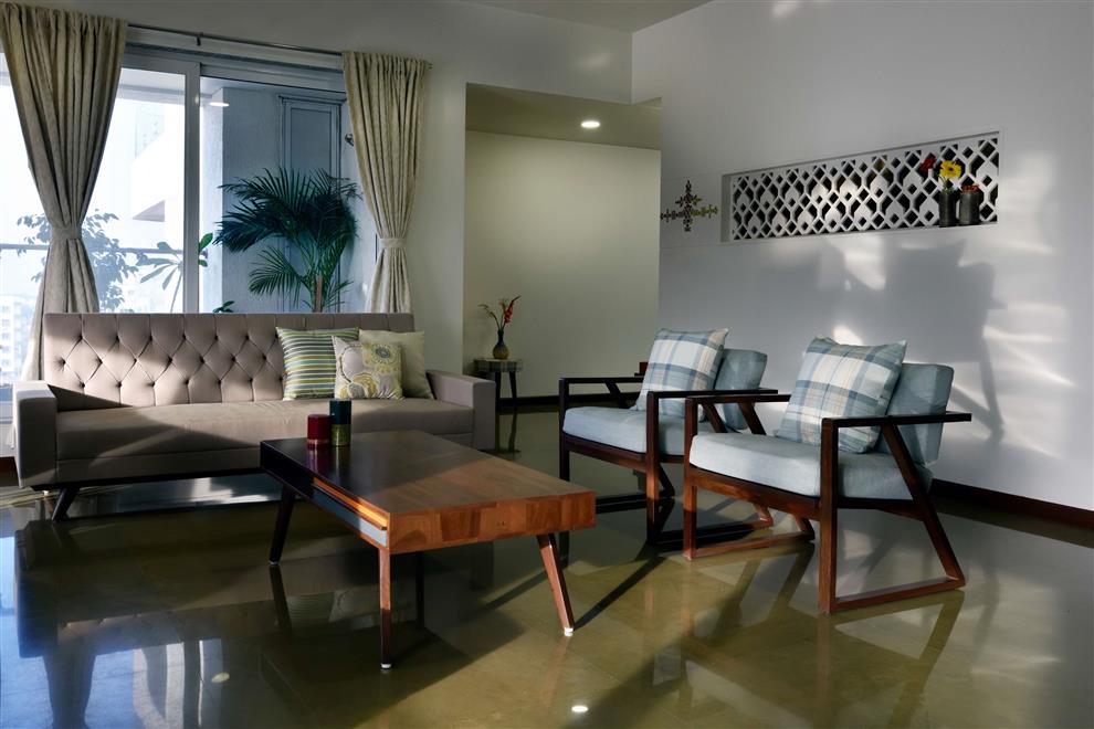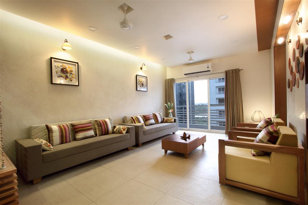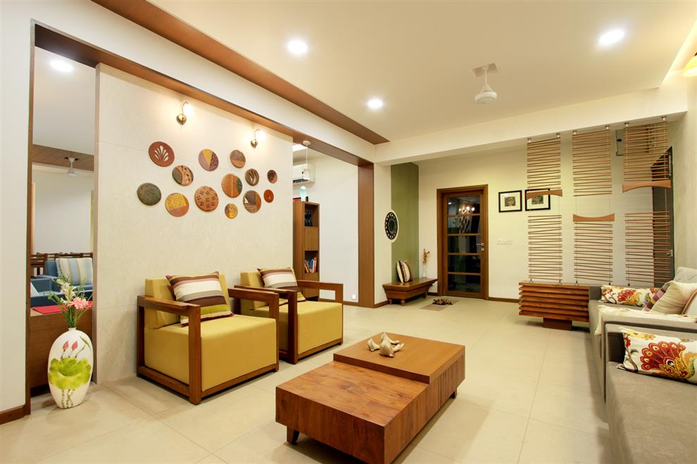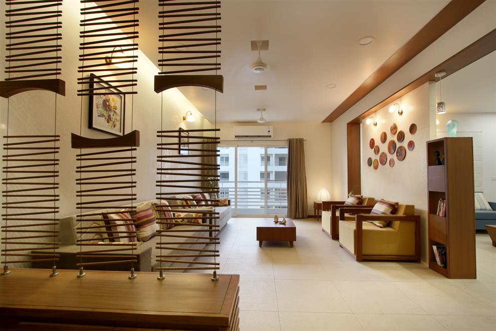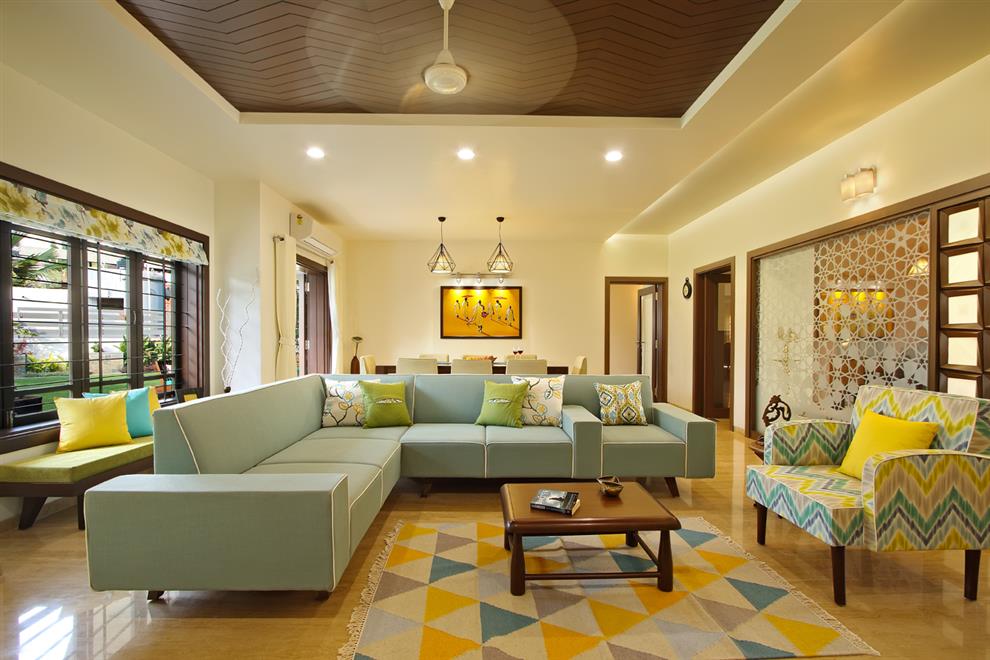 A typical Indian living room may contain furnishings such as a sofa, chairs, centre tables, and bookshelves, electric lamps and rugs.