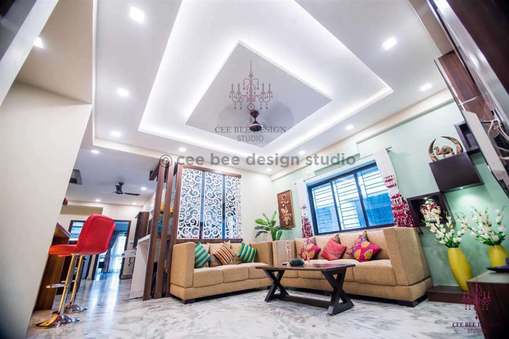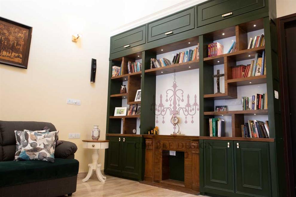 A typical Indian living room may contain furnishings such as a sofa, chairs, centre tables, and bookshelves, electric lamps and rugs.