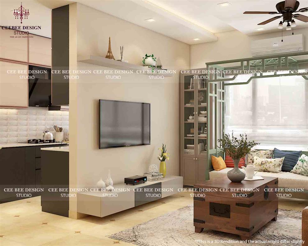 Often the dining area is a physical extension of the living area, and thus the room is aesthetically treated as one. Also most living rooms in India are equipped with a television.