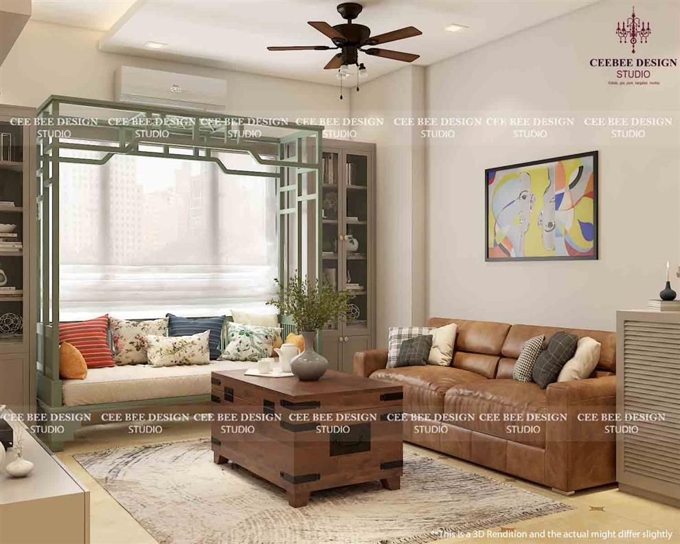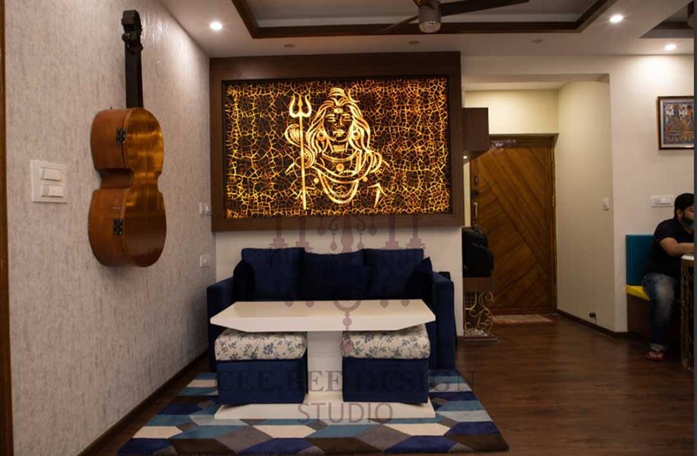 A typical Indian living room may contain furnishings such as a sofa, chairs, centre tables, and bookshelves, electric lamps and rugs.